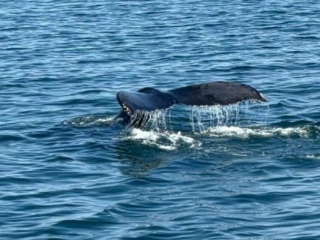 On a whale watching trip, groups are likely to see Finback whales. Other possible sightings include Humpback, Minke, Pilot, False Killer, and even a Sei whale. The warm waters attract giant ocean sunfish, sharks, tuna and marlin. Portuguese man of war, leatherback and loggerhead turtles, and varieties of dolphins might be seen.